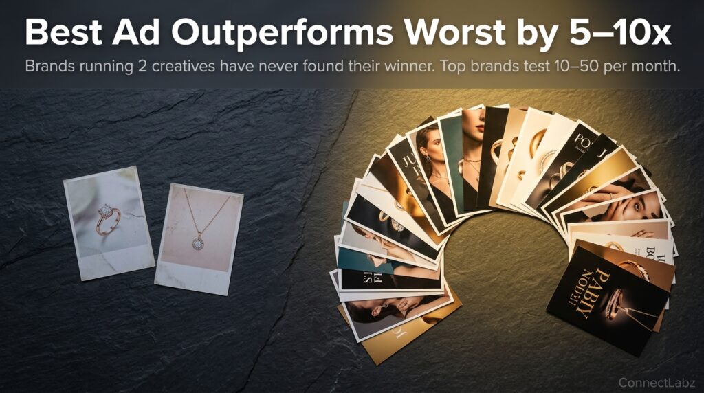 The best-performing ad in any given month outperforms the worst by 5 to 10 times. A brand running two creatives has one data point per ad, not a pattern. Top-performing jewelry brands test 10 to 50 creatives per month, not because of budget size but because volume is the only path to finding the winner. The same ad shown to the same audience repeatedly gets more expensive and less effective. Brands with thin creative libraries ride that fatigue curve until the cost per click becomes unsustainable.